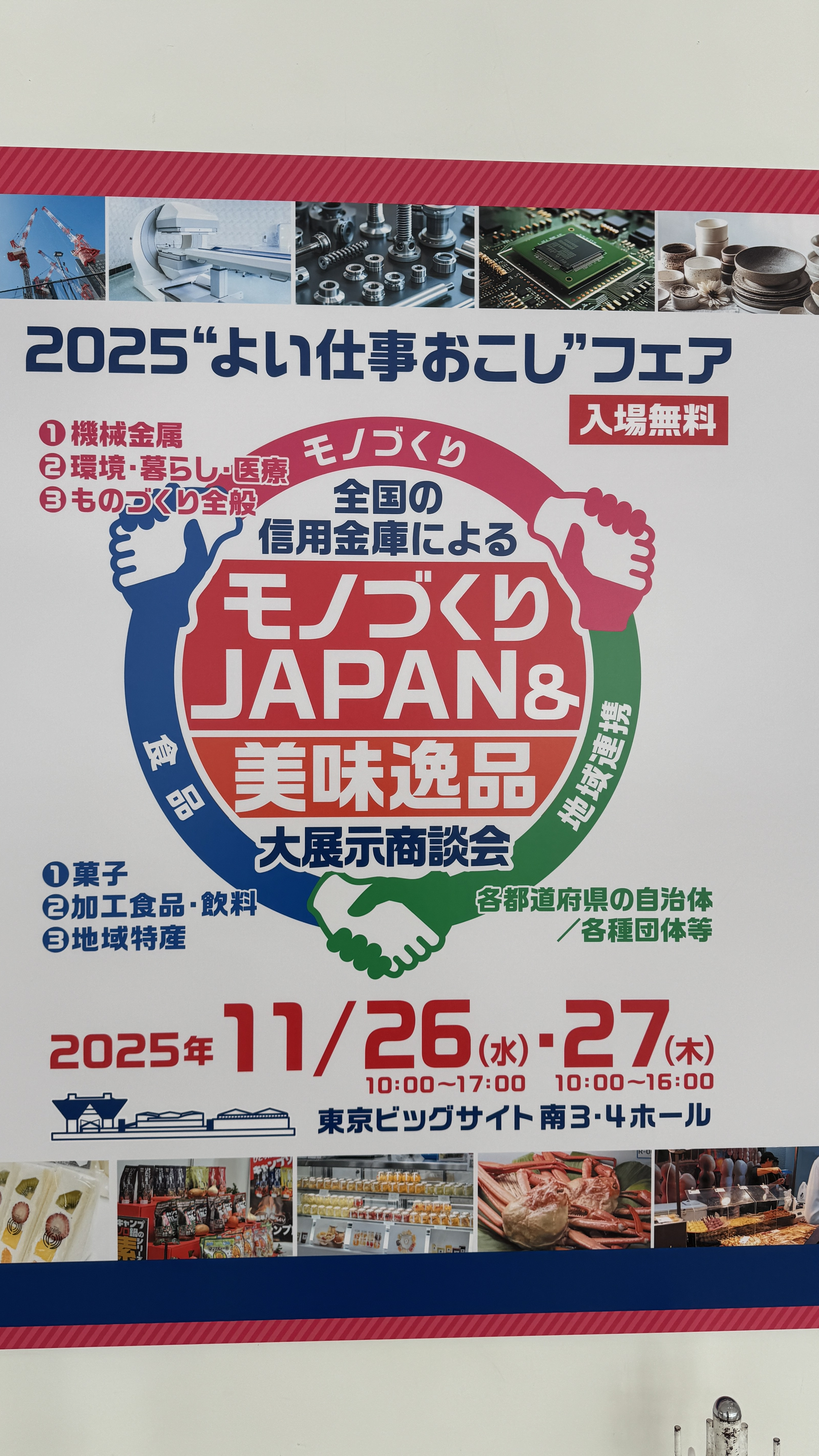 11月26日(水)、27日(木)の二日間、東京ビッグサイトで開催された**「2025”よい仕事おこし”フェア 全国信用金庫によるモノづくりJAPAN&美味逸品大展示商談会」**に参加させていただきました。