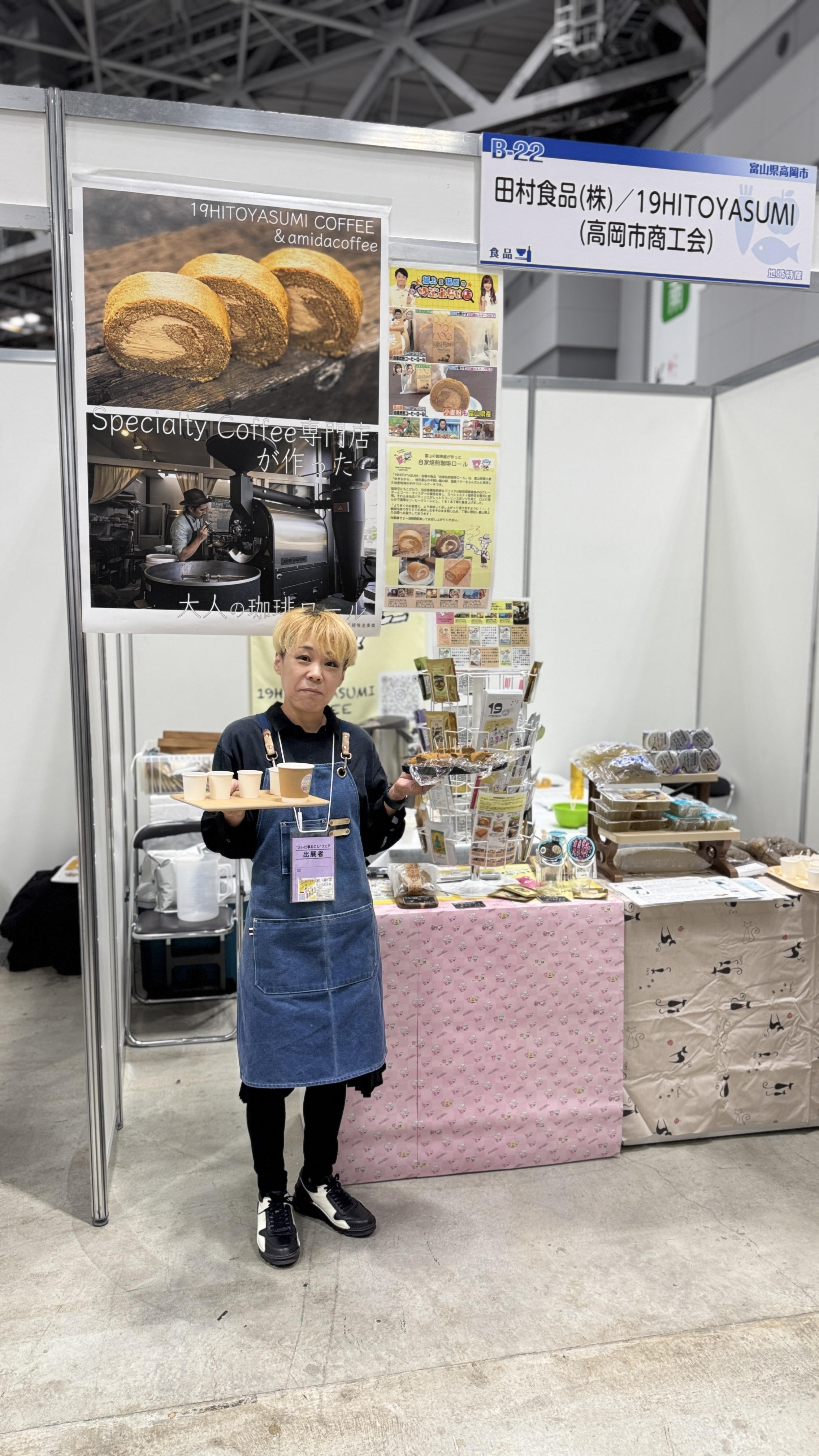 展示したのは、富山の食材を活かしたこだわりの商品たちです。特に、時間をかけて自家焙煎したコーヒー豆を使用し、豊かな香りと味わいを追求した**「自家焙煎コーヒーロール(大人のコーヒーロール)」は、私たちの看板商品です。加えて、今回初めてお披露目となった、富山の風景や名産をモチーフにした「富山面白ろマグネット付きドリップパック」**も持参しました。
